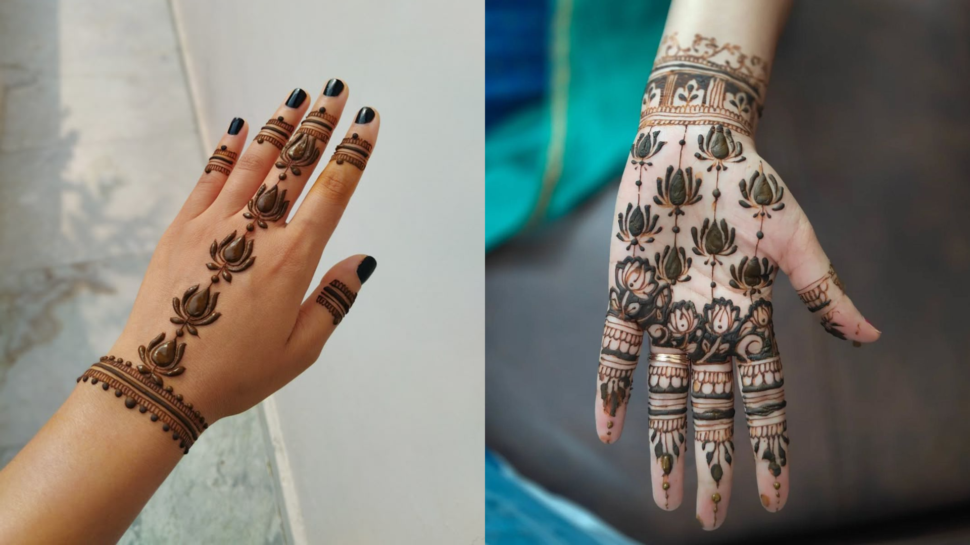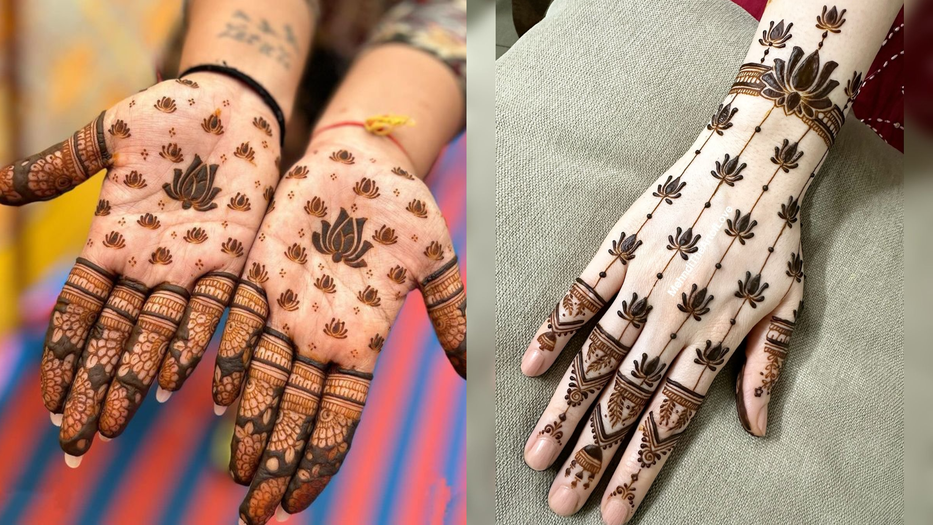 This simple Mehendi features a beautiful half lotus motif placed gently at the palm base, complemented by soft petals and small, delicate dots.