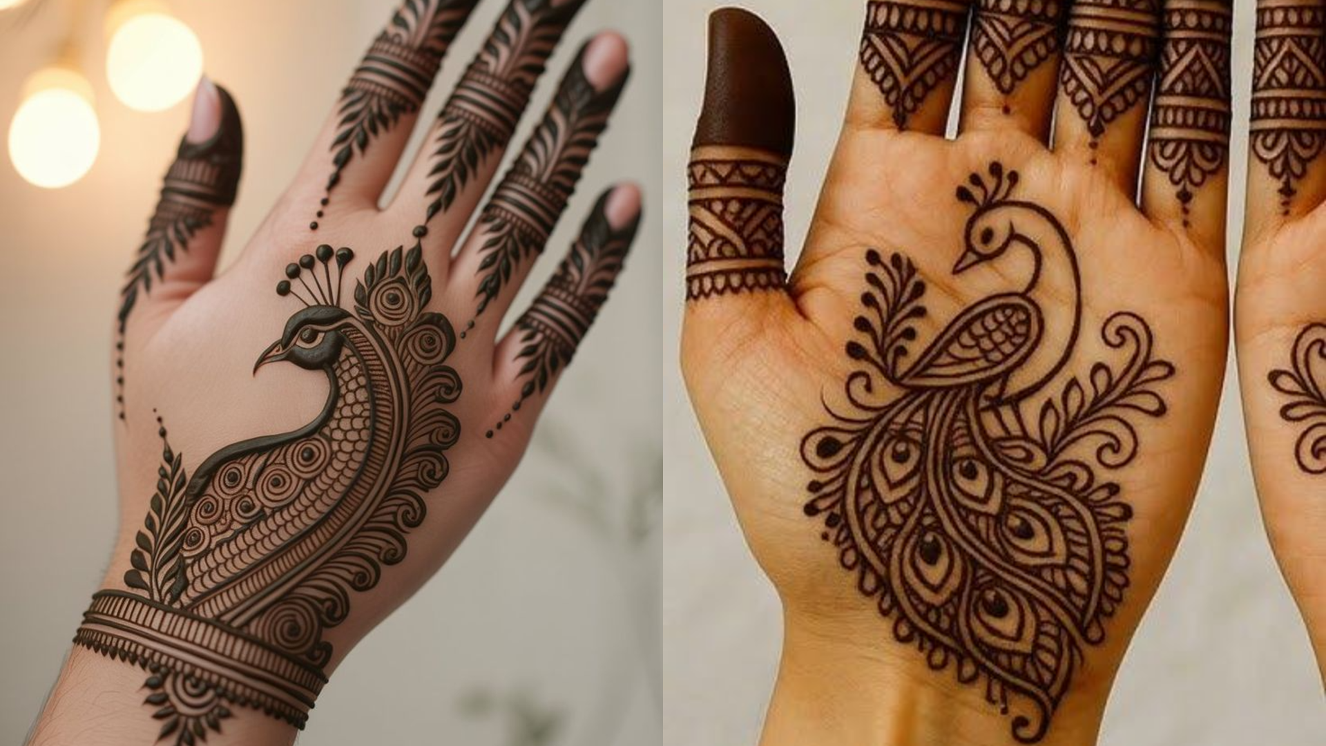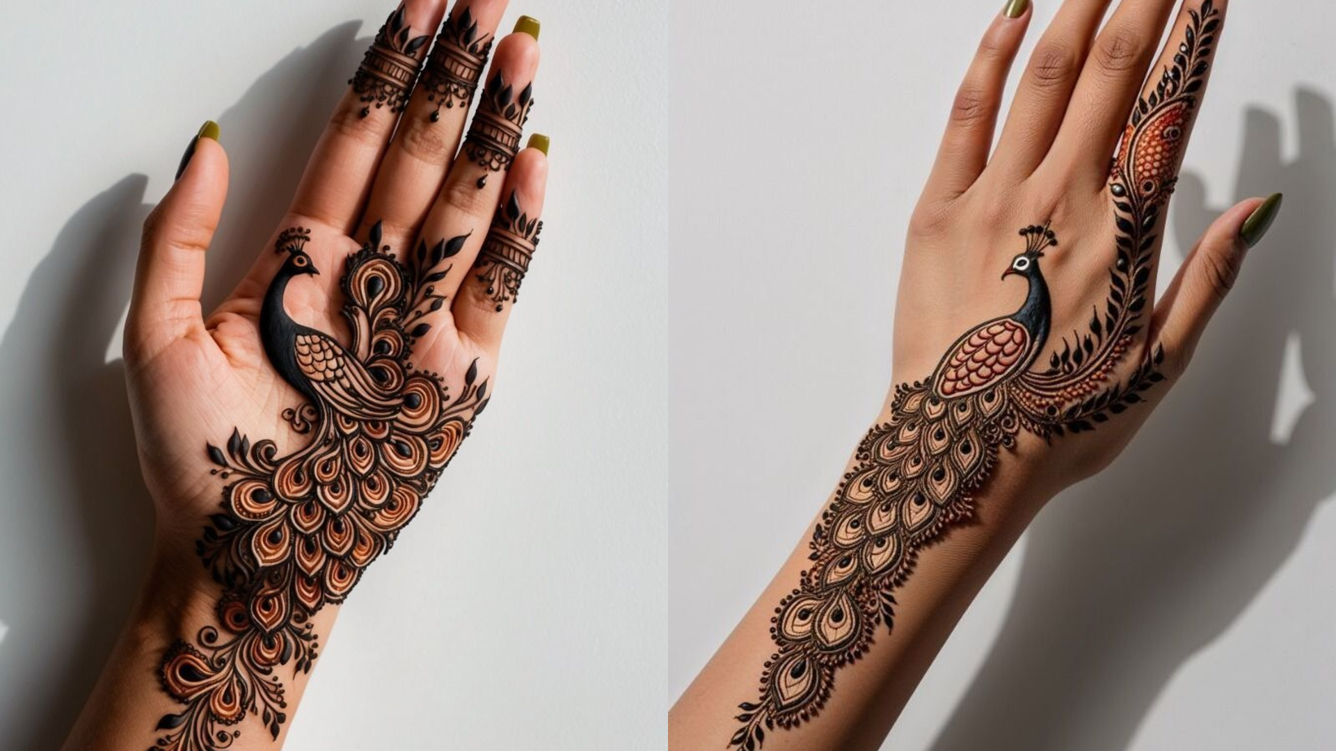 The Simple Peacock Motif offers a touch of royalty without the fuss. This traditional simple design focuses on drawing a beautiful, single peacock motif placed gracefully right on the palm edge.