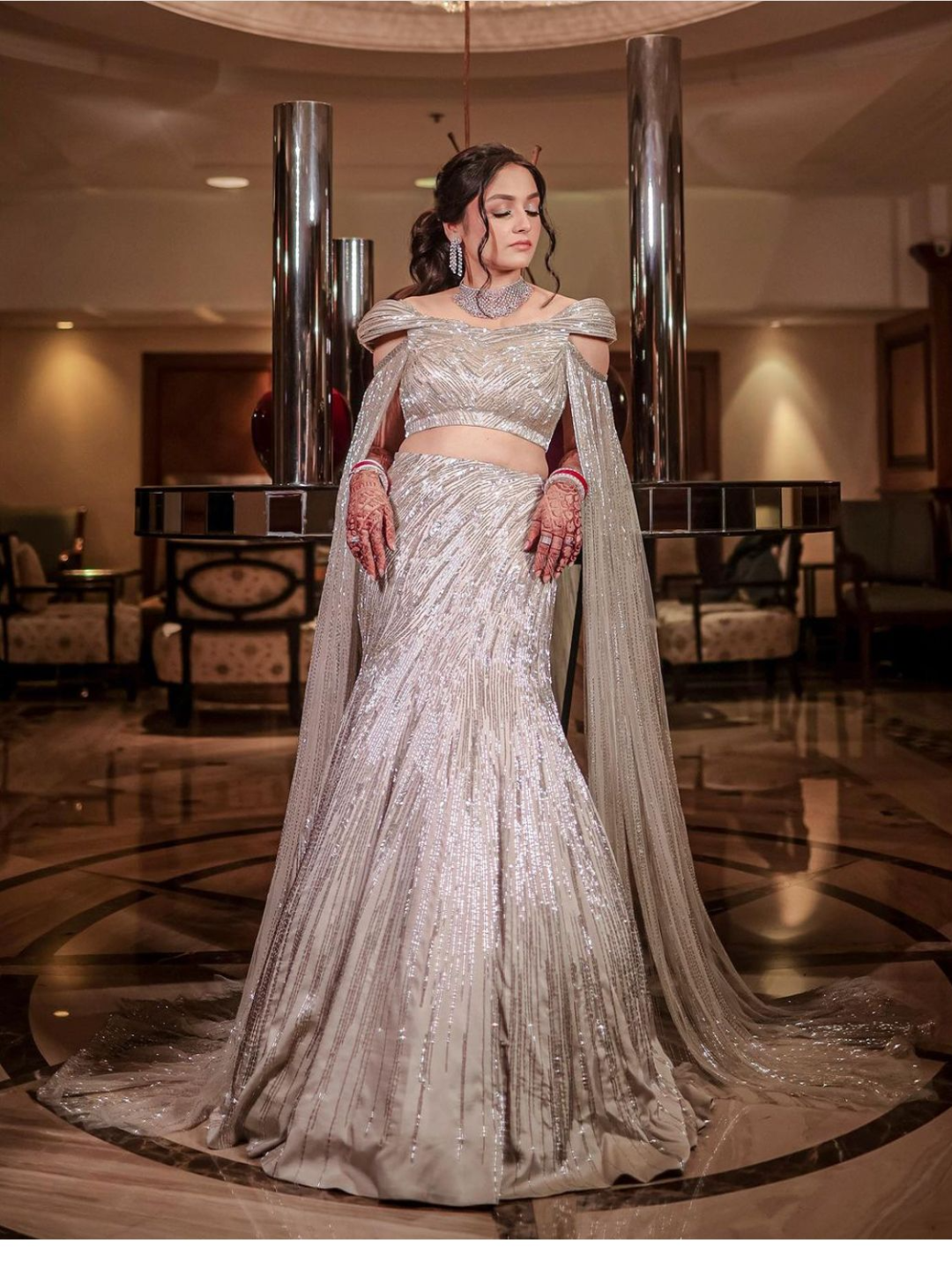 Indo-western drapes and cape gowns blend tradition and modern bridal engagement styling.